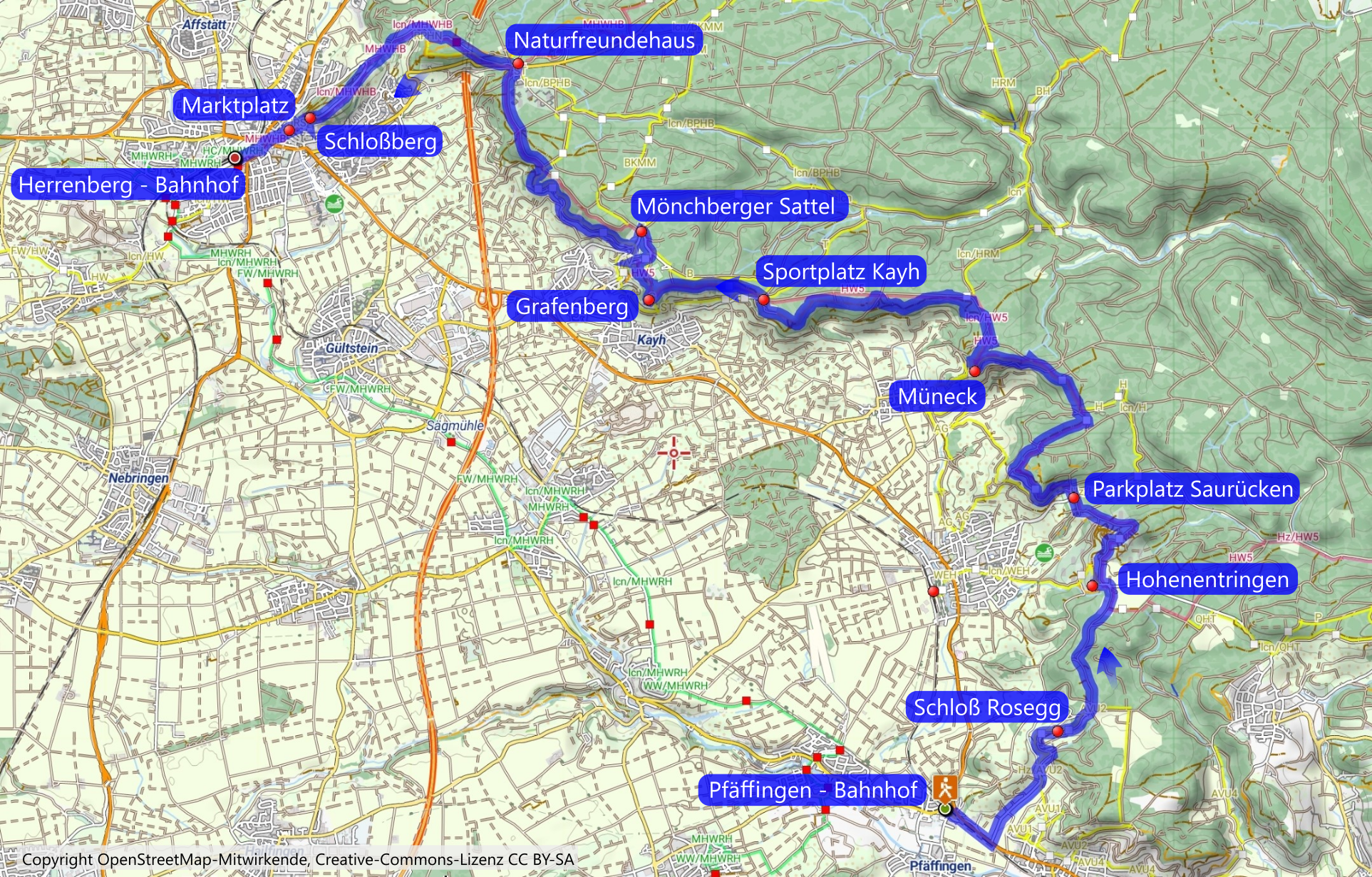 Zugegeben: Der Begriff “Promenade” ist im Kontext dieser Wanderung eine heftige Untertreibung. Diese Tour ist einer der längsten auf diesen Webseiten. Aber es ist auch eine ganz Besondere: Hier kombinieren wir die bereits beschriebenen Rundtouren Schönbuchtrauf und Schönbuchspitz zu einer aussichtsreichen Streckenwanderung, die dem Trauf fast in seiner ganzen Länge folgt. Die Ammertalbahn löst elegant die Logistik: Vom Bahnhof Pfäffingen steigen wir durch die Weinberge direkt zum Schönbuchrand, dem wir bis Herrenberg folgen. Unterwegs passieren wir die Schlösser Rosegg und Hohenentringen, sowie Aussichtspunkte wie Müneck und Grafenberg. Auch der Abstieg zum Bahnhof Herrenberg setzt mit Stiftskirche und Altstadt fotogene Akzente.
