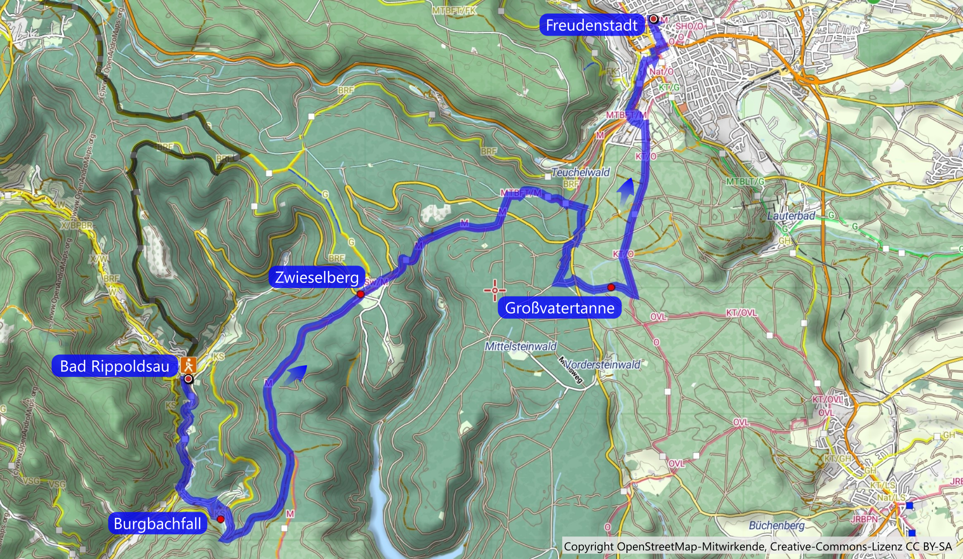 Auf der zweiten Etappe dieser Tour entdecken wir den versteckten und eher unbekannten Burgbach Wasserfall. Auch auf dem Weiterweg über Zwieselberg haben wir meist den Wald für uns alleine. Erst ab der riesigen Großvatertanne mischen wir uns unter die Spaziergänger, die uns von Freudenstadt entgegen kommen.