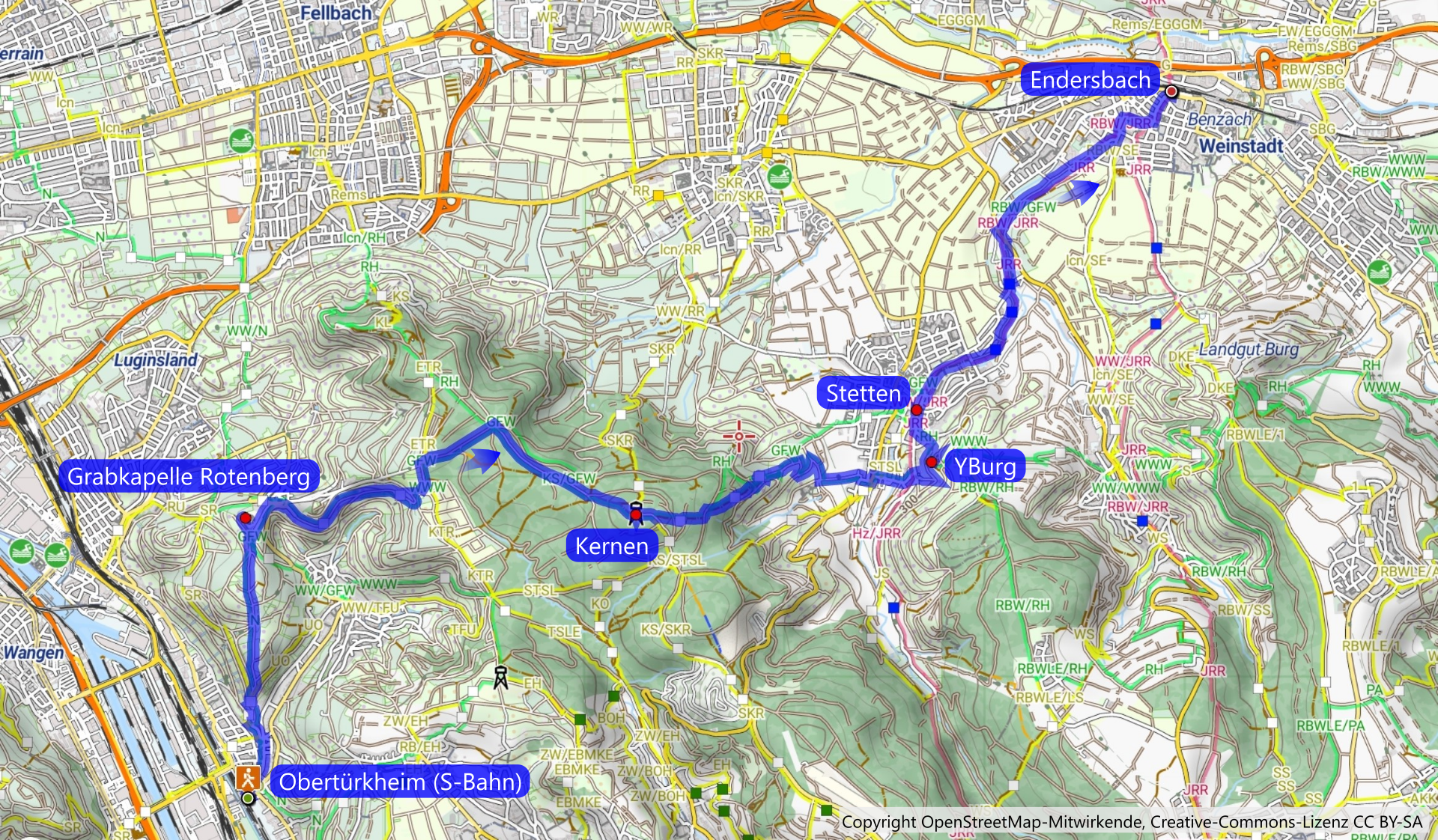 Was für ein kontrastreicher Ausblick von der romantischen Grabkapelle Rotenberg: wir spazieren inmitten von Weinbergen und Obstwiesen und unter liegt das industrielle Stuttgart mit Daimler und dem Kraftwerk in Münster. Allein dieser Moment war die Reise schon wert. Aber dann kommen noch Kernenturm, schöne Waldpassagen und der gemütliche Abstieg nach Stetten mit der Y Burg vor Augen. Mit der S-Bahn kommen wir elegant wieder in die große Stadt zurück.